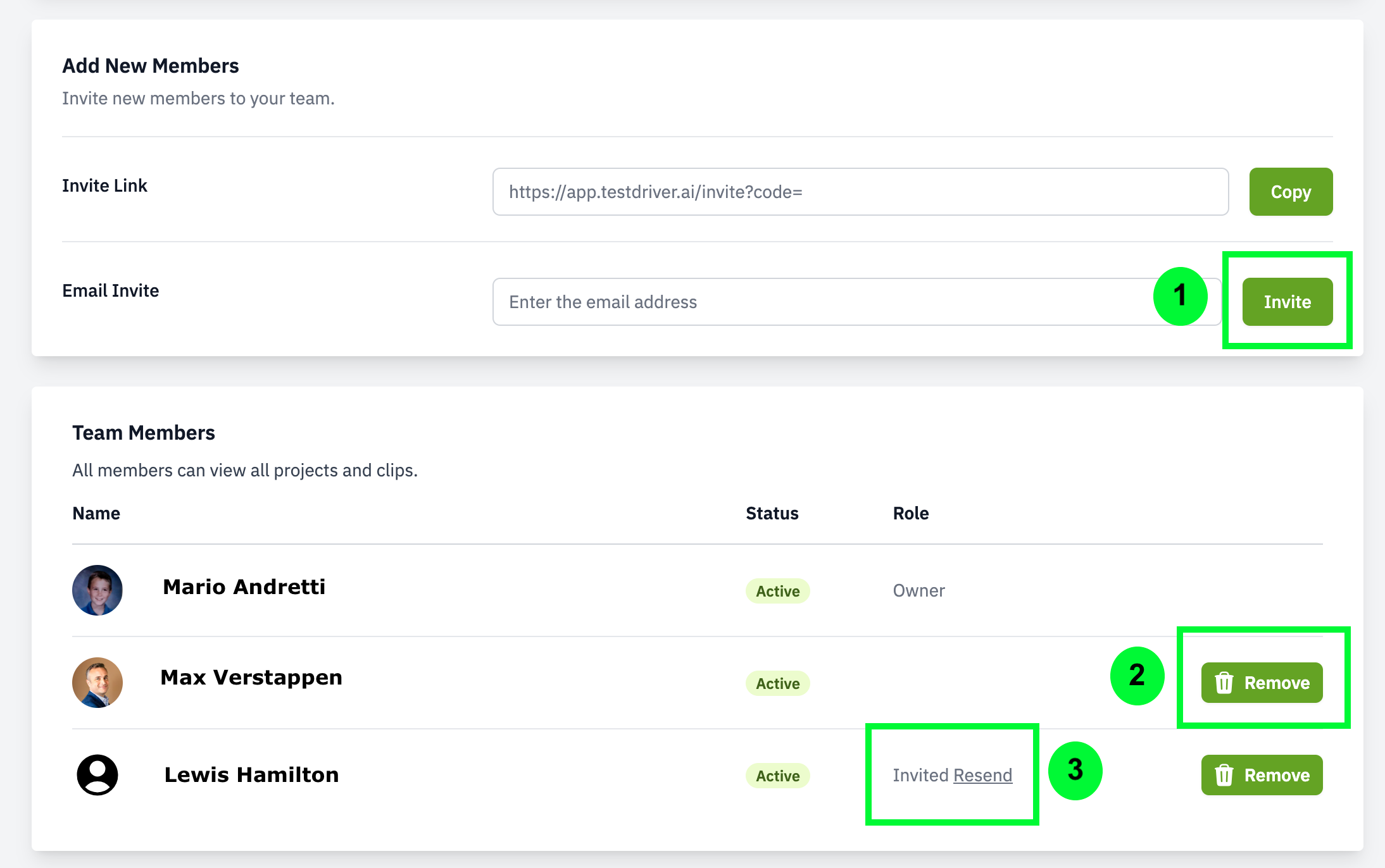 - Removing Team Members: To remove a team member, click the Remove button next to their name. This will revoke their access to your TestDriver account.